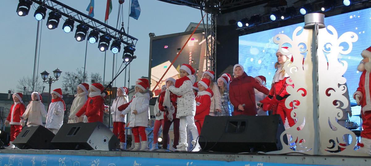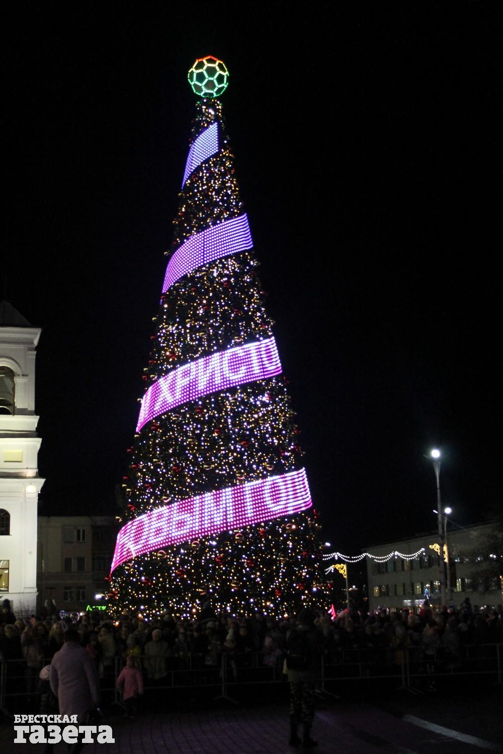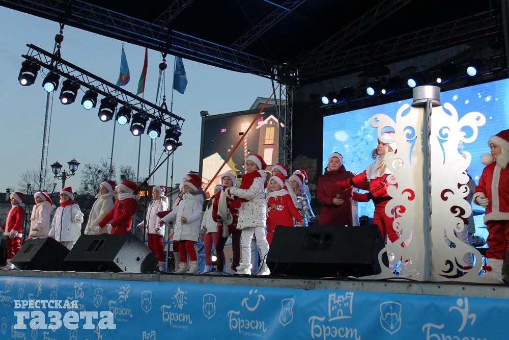 Для зажжения главной новогодней елки города на сцену пригласили председателя Брестского горисполкома Александра Рогачука, который сделал это в компании преданного фаната ФК «Динамо Брест» Никиты Полуянова и легендарного футболиста брестского футбольного клуба Романа Василюка.