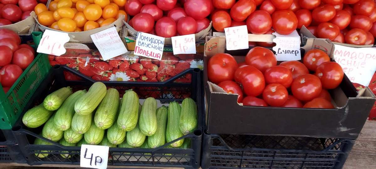 Продолжают падать в цене сезонные помидоры и огурцы. Томаты пока продают, в основном, привозные, но в широком ассортименте. Есть и красные, и желтые, и черри нескольких видов. Огурцы, в основном, привозят местные со своих участков.