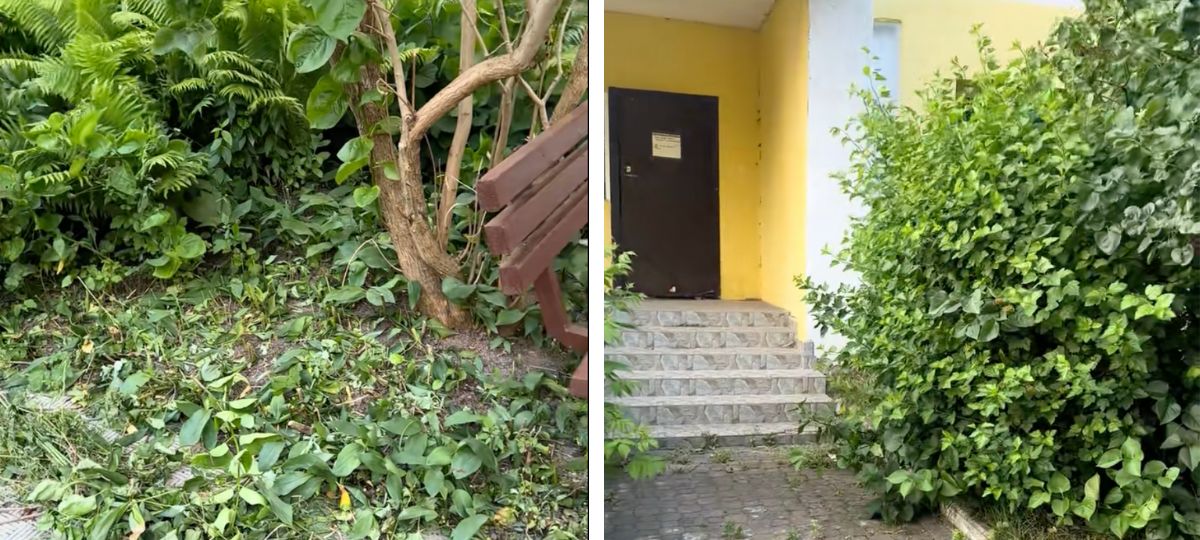 На видео, которое женщина выложила в сеть, видно: подстригли кусты сирени, а не тот кустарник, еще и вовсе не у того подъезда, где она просила. Коммунальщики поработали где-то поблизости — во дворе, но мимо нужного адреса.