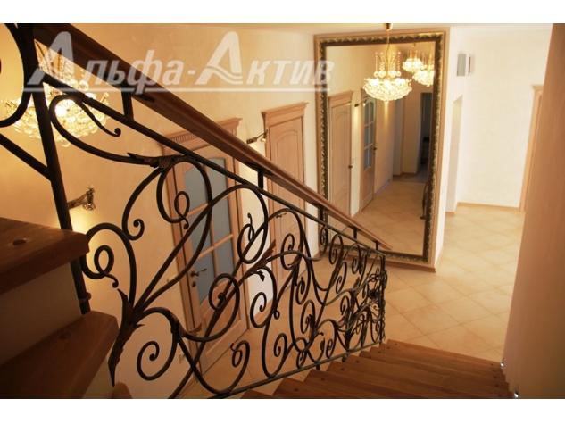 Внутренний дизайн дома выполнен по проекту московской студии. Лестница из массива дуба с художественной ручной ковкой. В гостиной камин на дровах с облицовкой из светлого мрамора. Кухня — массив ясеня.