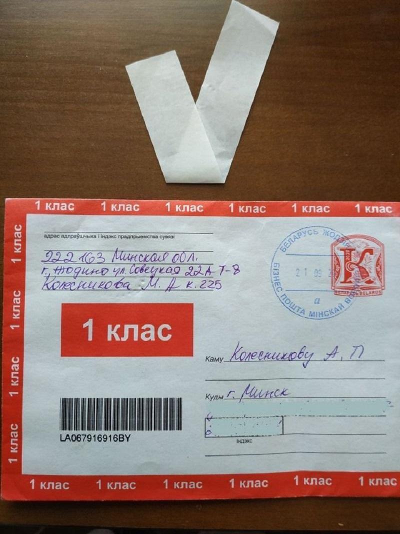 «Папа наконец получил письмо от Марии с бело-красно-белыми сердечками и белой лентой в конверте! Письмо шло из Жодино в Минск полторы недели. На главное – дошло. Маша передает всем привет, волнуется за нас всех и просит не сдаваться», – написано в посте.