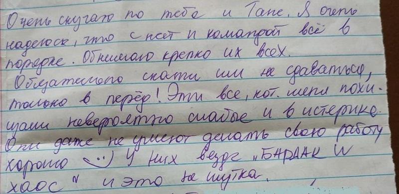 «Обязательно скажи им не сдаваться, только вперед! Эти все, кто меня похищали, невероятно слабые и в истерике. Они даже не умеют делать свою работу хорошо :)) У них везде «БАРДАК И ХАОС». И это не шутка».