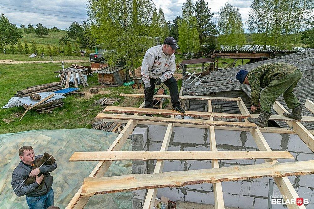 Спустя месяц, 16 мая, фотограф Сергей Плыткевич, автор того фоторепортажа, снова наведался на ферму. Ее владелец вместе со своими сыновьями и их друзьями вовсю строили для медведицы не вольер, а целый дом с выходом в лес.