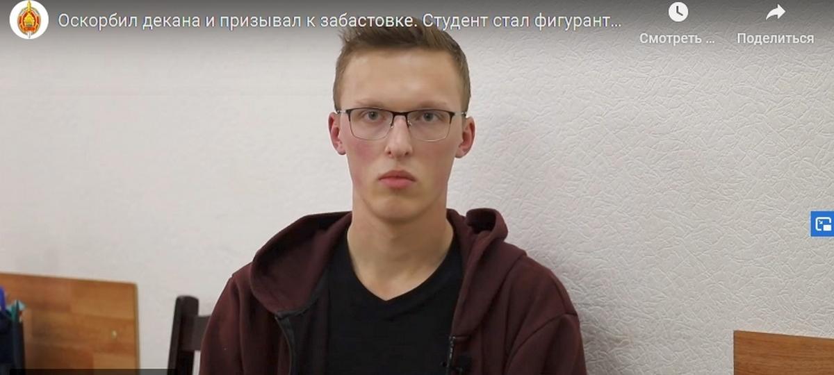 Студента задержали. На видео, которое опубликовала милиция, третьекурсник говорит, что накануне ему написал в телеграм-канале неизвестный человек и попросил призывать студентов к забастовке. Ему выслали примерный текст выступления и попросили удалить переписку.