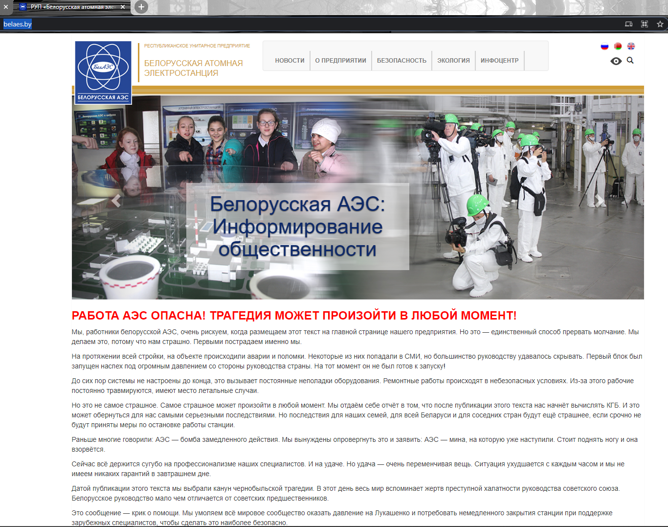 Днем 25 апреля, накануне 35-летия взрыва на Чернобыльской АЭС, на сайте Белорусской АЭС появилось сообщение, подписанное якобы «небезразличными сотрудниками» и в котором говорилось об опасности атомной электростанции.
