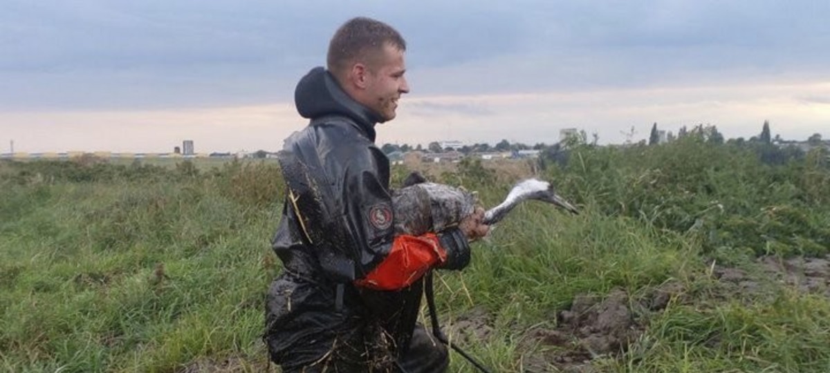 25 сентября брестский орнитолог Александр Сербун отправился наблюдать за куликами и другими птицами на водоемах-очистителях возле агрогородка Остромечево. Там он увидел серого журавля, который попал в отстойник и не мог выбраться. Молодая птица находилась всего в 10 метрах от берега, но вязкая жидкость не позволяла ей выбраться на берег. Об этом сообщает onliner.by.