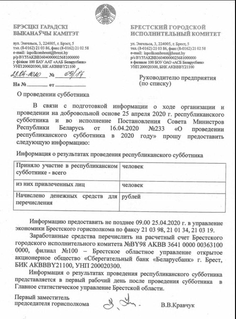 Согласно ему, до 9 утра 25 апреля они должны сообщить в горисполком о том, сколько человек от предприятия примут участие в субботнике и какая сумма начислена для перечисления. Заработанные деньги нужно будет направить на расчетный счет горисполкома.