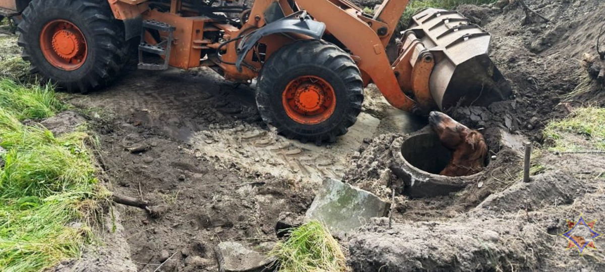 Благодаря водителю и спасателям «операция» прошла успешно. Расчистив землю вокруг и сняв два кольца, кобылу Полину достали на поверхность.