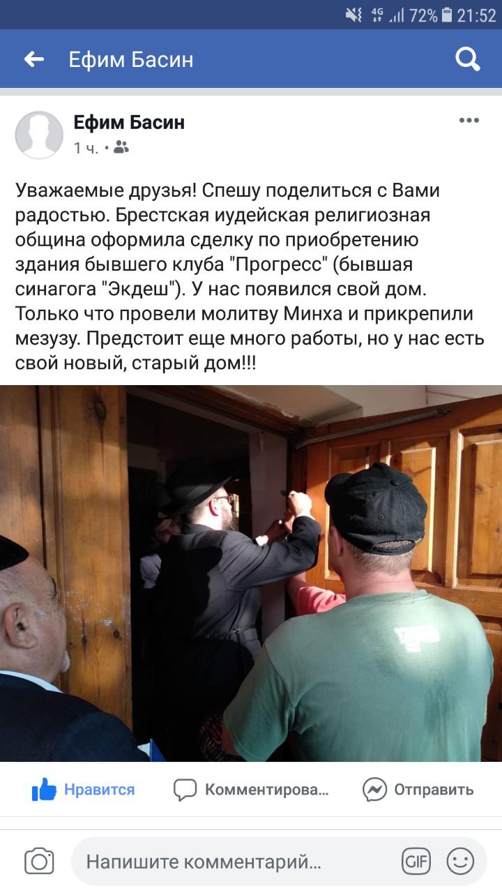«У нас появился дом!», — написал на своей странице в Facebook исполнительный директор Брестского еврейского благотворительного центра «Хэсэд-Давид», краевед Ефим Басин.