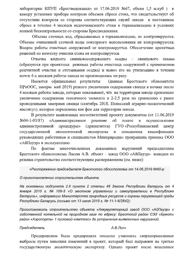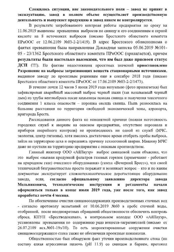Речь в письме идет о нецелесообразности размещения свинцового производства в густонаселенном пригороде Бреста. Борцы с заводом аргументируют свою позицию и среди прочего пишут об абсурдности ситуации с санитарно-защитной зоной и указывают на то, что «не была проанализирована предыдущая деятельность Лемешевского В.М., бизнес которого связан со свинцовыми АКБ». Активисты обращают внимание и на то, что государственная экологическая экспертиза нового, не имеющего аналогов в РБ, промышленного объекта, была проведена всего за пять рабочих дней без каких-либо замечаний.