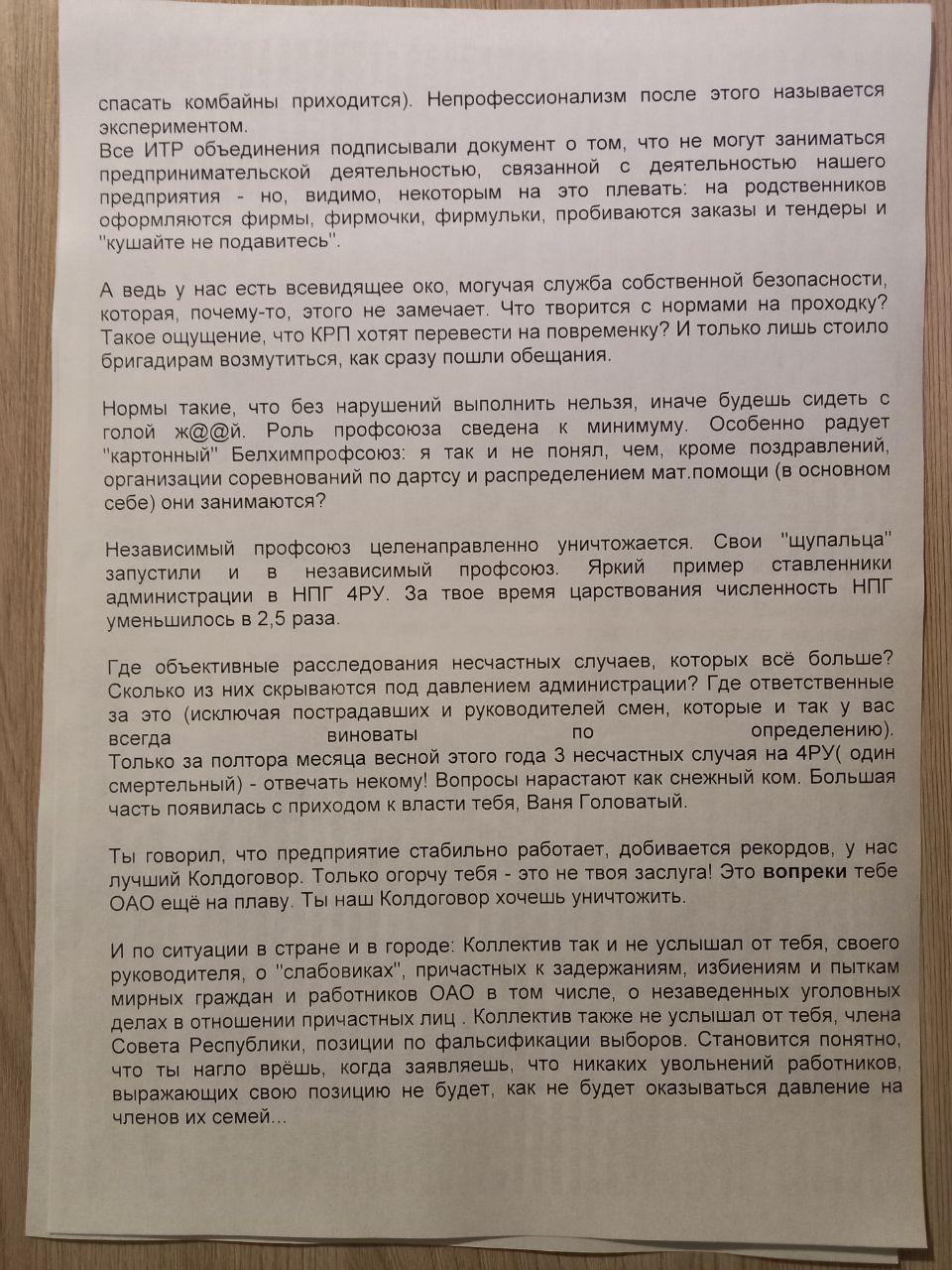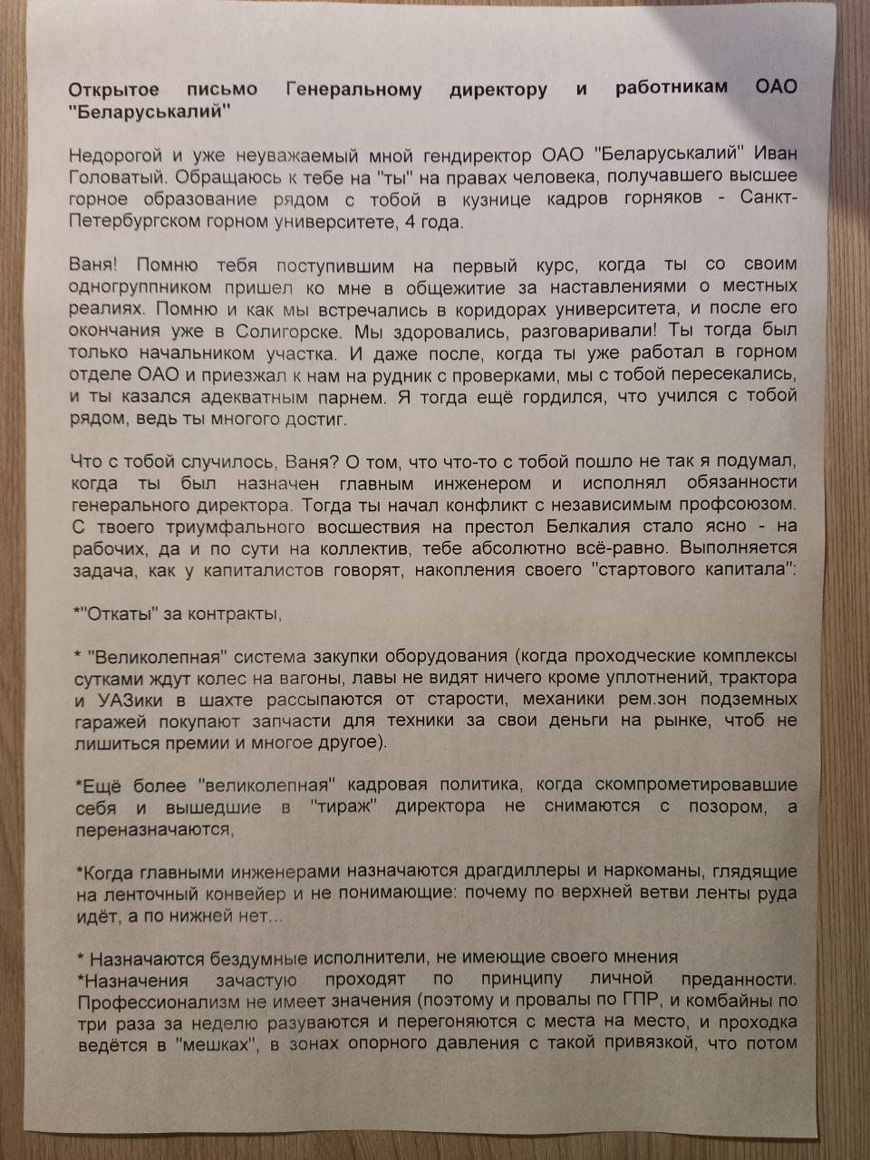 Позже на связь со стачкомом вышла жена рабочего, объявившего протест, и передала его требования. Начинается обращение со слов «недорогой и уже неуважаемый мной директор». Мужчина написал, что с Иваном Головалым, руководителем «Беларуськалия», они учились рядом – в Санкт-Петербургском университете горняков. И когда-то он этим гордился. Далее он пояснил, почему уже нет, и обратился к своим коллегам, задав им вопрос: «готовы ли подчиниться такому руководителю?».
