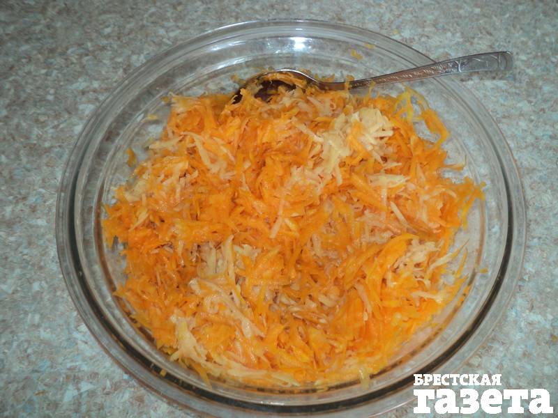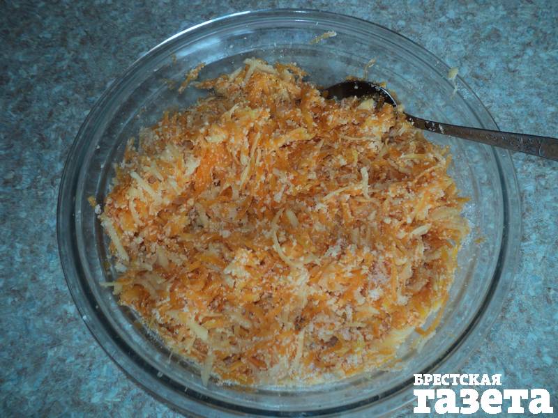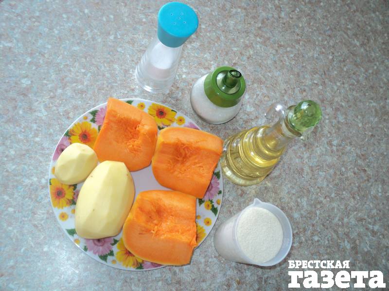 Надо: 450 г тыквы, 250 г картофеля, 1 ст. манной крупы, 1 ст. л. сахара, 1 ч. л. соли, растительное масло для жарки.