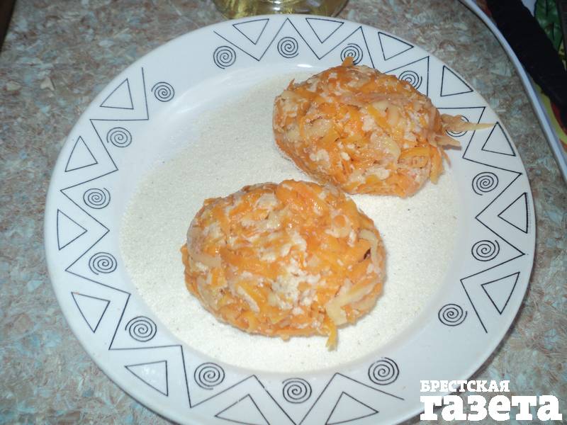 4. Сформируйте котлеты среднего размера. Обваляйте их в оставшейся манной крупе.