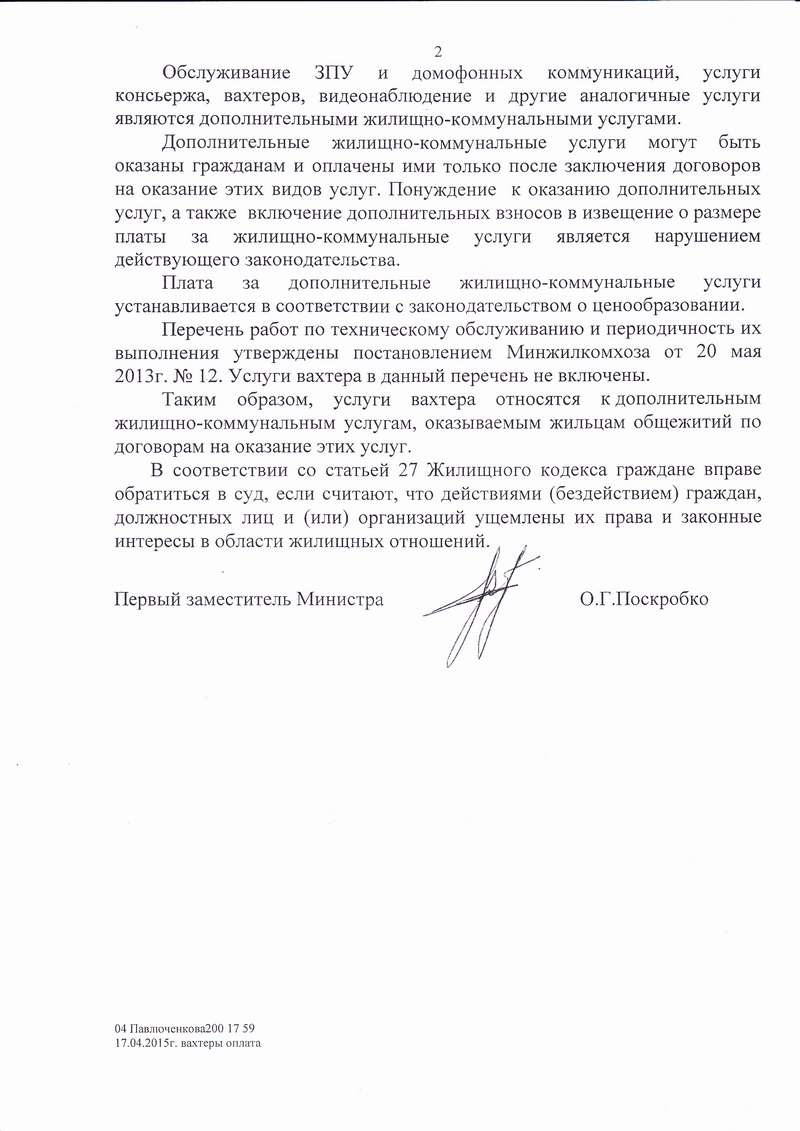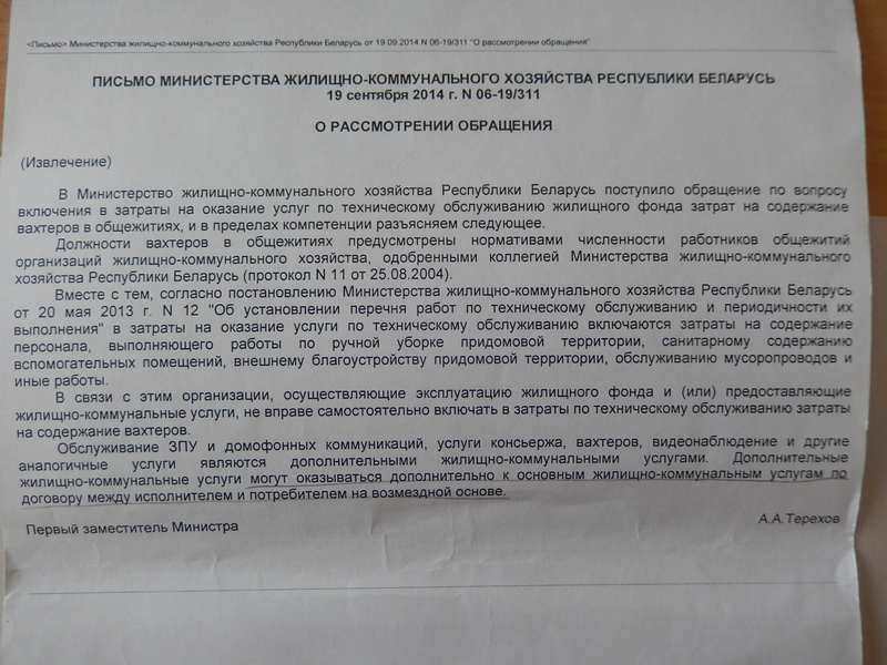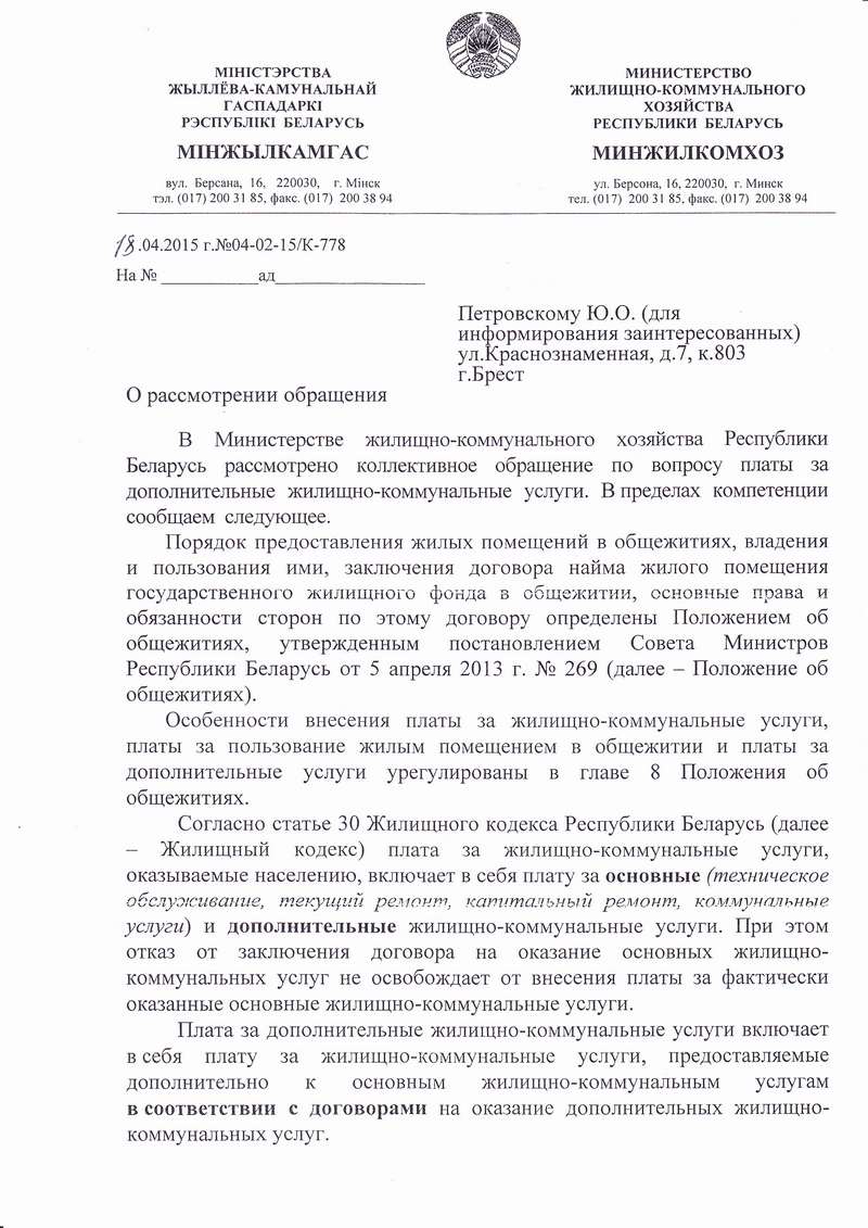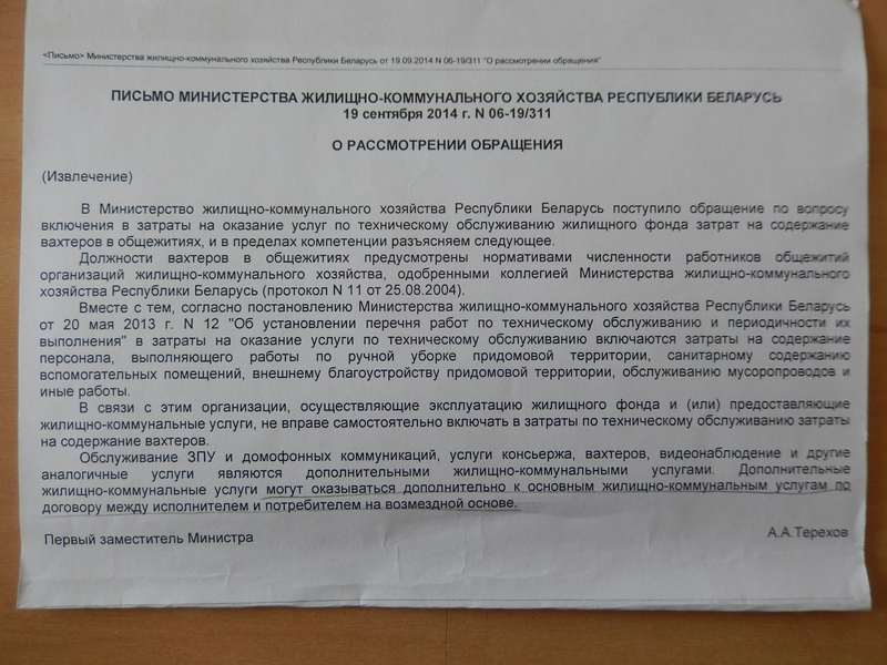 Заместитель председателя совета общежития по ул. Краснознаменной, 7 Юрий Петровский рассказал корреспонденту «БГ», что на коллективное обращение его жильцов в Министерство жилищно-коммунального хозяйства был получен ответ за подписью первого заместителя министра О.Г. Поскробко. В нем сказано: «Дополнительные жилищно-коммунальные услуги могут быть оказаны гражданам и оплачены ими только после заключения договоров на оказание этих видов услуг. Понуждение к оказанию дополнительных услуг, а также включение дополнительных взносов в извещение о размере платы за жилищно-коммунальные услуги является нарушением действующего законодательства».