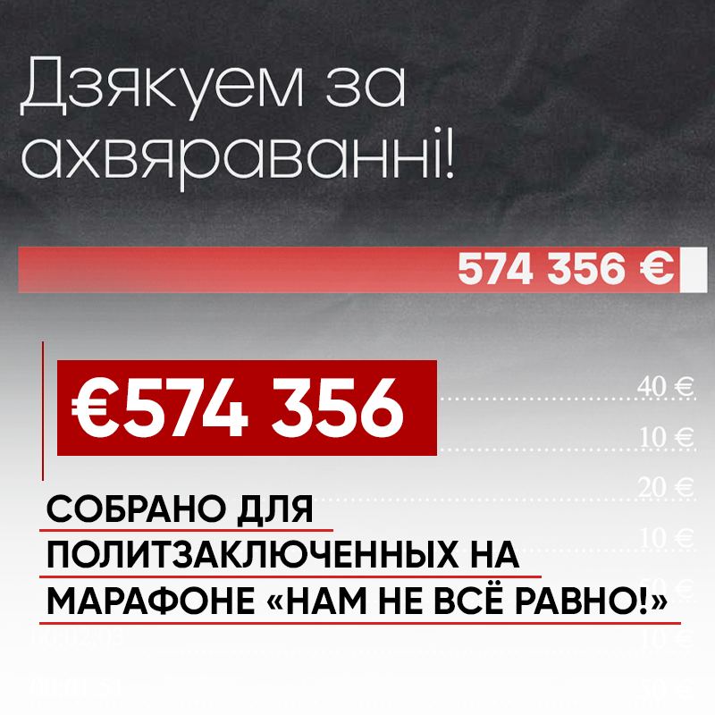 В рамках онлайн-марафона солидарности с беларускими политзаключенными «Нам не все равно!» за два дня беларусы пожертвовали более 574 356 евро. На сайте salidarnasc.com сумма чуть больше — 574 617 евро.