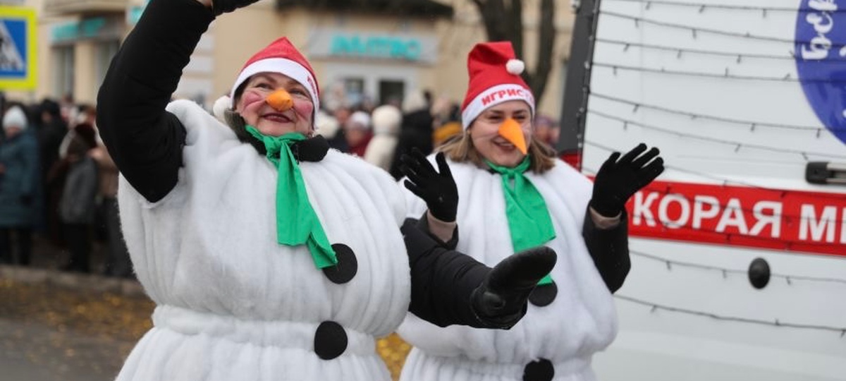В совокупности все это разнообразие выглядело как сны при температуре +39°: фура с танцующими шампиньонами, люди-елки на квадроциклах, движущийся трактор-айсберг, сотрудницы родильного дома с морковью на носу, ходячие батон и круассан.