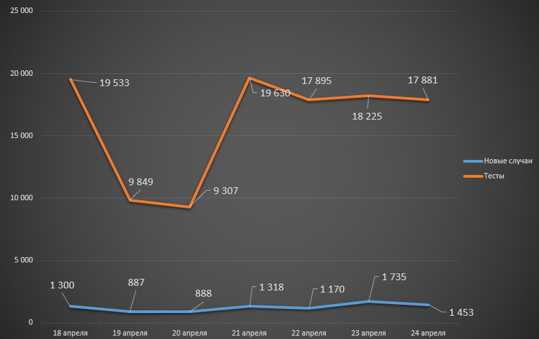 Что касается количества выполненных тестов, то за период с 18 по 24 апреля их было 112 320 (на предыдущей неделе – 111 813), а официальная смертность опять поднялась на 1: неделей ранее было зафиксировано 69 летальных исходов, за последние исследуемые семь дней – 70.