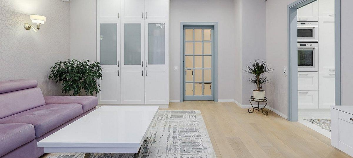 В квартире – очень высокие потолки – 3,43 метра. Входная дверь металлическая, но межкомнатные деревянные.