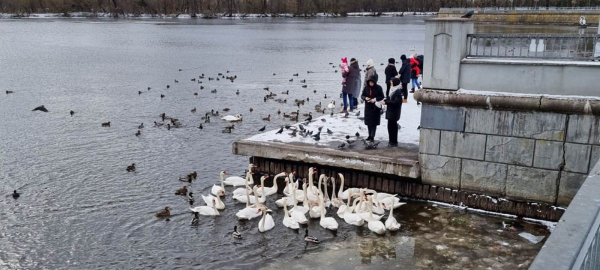 20.01.2026 16:14 Люди кормят лебедей на набережной в Бресте. Источник фото