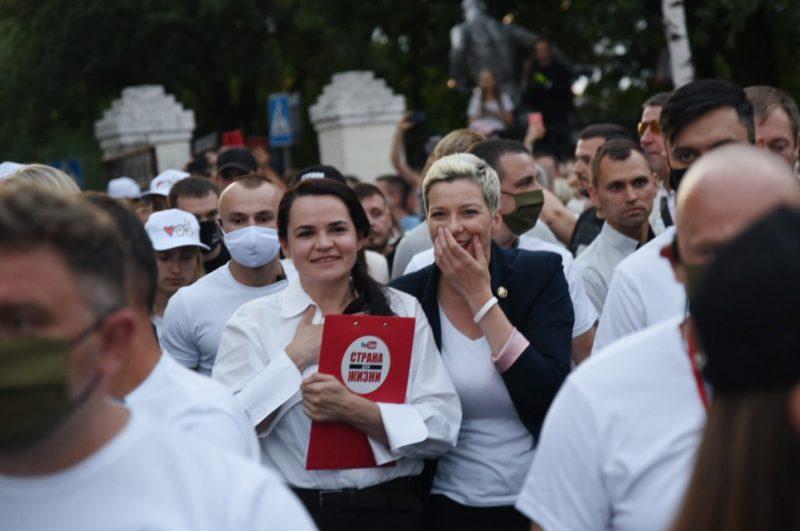«Света! Света! Света!» – скандирует стадион, когда на сцене появляется Тихановская. Женский триумвират – это три тоненьких, фигуристых барышни, которые, бьюсь об заклад, даже одежду подбирают в одной гамме. В этот субботний вечер – черно-белой.