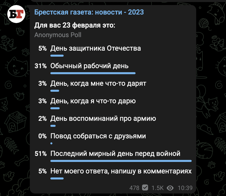 На момент публикации материала в опросе в нашем телеграм-канале приняло участие 478 человек. Более половины его участников (244 человека) отметили, что 23 февраля для них – это последний мирный день перед началом войны. Для трети ответивших на наш вопрос (147 человек) – это обычный рабочий день. Лишь 5% проголосовавших (23 человека) считают этот день праздником.