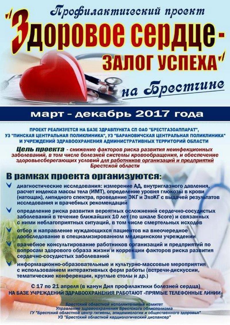 В здравпункте предприятия «Брестгазоаппарат» 23 марта взял свое начало полномасштабный профилактический проект. Здесь два дня работники предприятия проходили диагностические обследования: измеряли артериальное и глазное давление, рассчитывали индекс массы тела, определяли уровень глюкозы в крови, делали электрокардиограмму. Все желающие могли получить консультации кардиолога, терапевта, офтальмолога. В случае необходимости специалисты направляли пациентов на внеочередное дообследование в областной кардиологический диспансер.