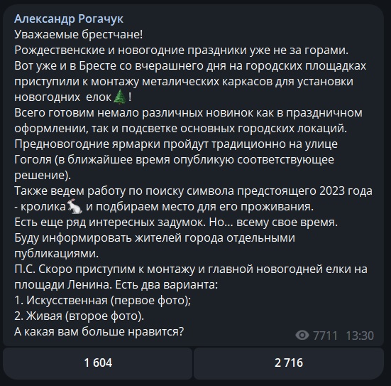 Несколько постов телеграм-канала А. Рогачука были посвящены главной елке на площади Ленина. 9 ноября в нем шла речь о подготовке города к новогодним и рождественским праздникам. А еще подписчикам было предложено проголосовать, какую елку установить на площади Ленина: искусственную или живую.