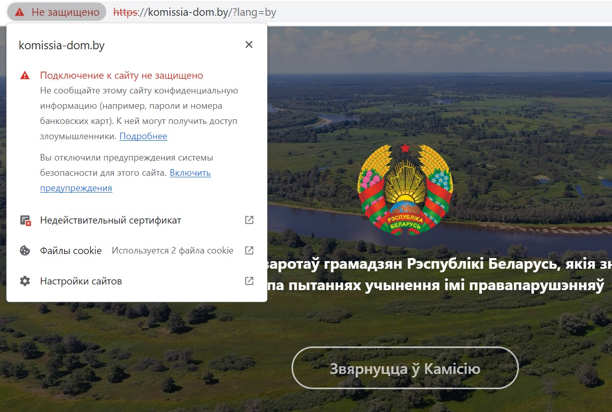 А что касается сайта, то при попытке открыть страницу комиссии в Google Chrome браузер предупреждает, что подключение к этому сайту не защищено, и советует «не передавать конфиденциальную информацию», так как к ней могут получить доступ преступники, пишет «Белсат».