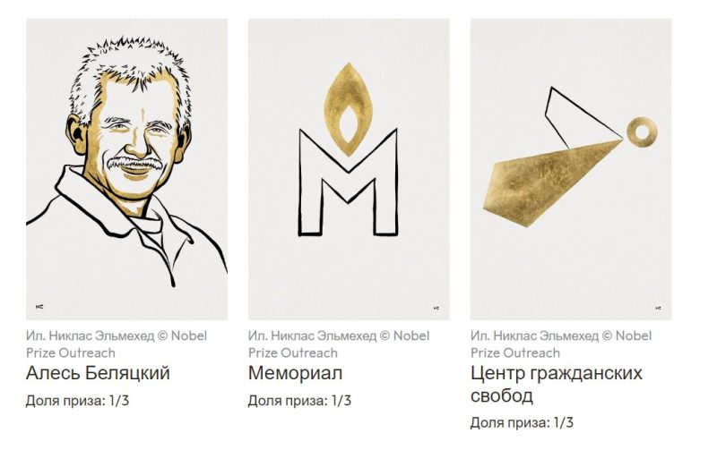 Правозащитник Алесь Беляцкий стал лауреатом Нобелевской премии мира. Она также присуждена российской правозащитной организации «Мемориал» и украинской правозащитной организации «Центр гражданских свобод».