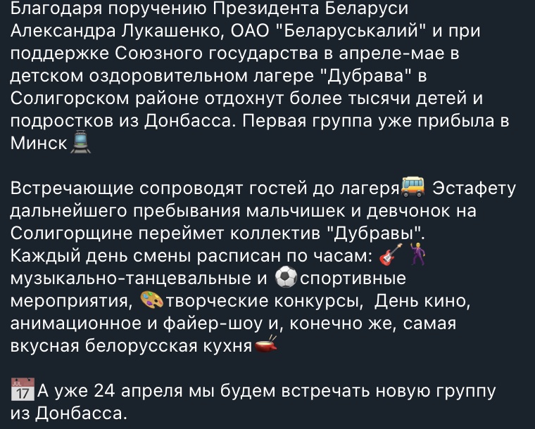 А уже в этом году, 4 апреля, первый секретарь ЦК БРСМ Александр Лукьянов написал на своей странице в Facebook, что в Минск прибыла очередная партия украинских детей с оккупированных территорий в составе 350 человек. Часть детей – сироты из детского дома города Антрацит, часть – имеющие родителей дети из Мариуполя и Горловки.