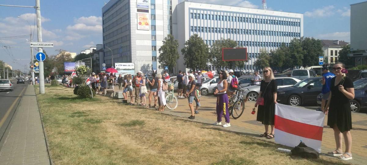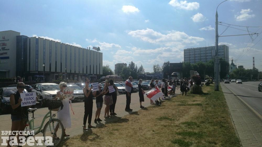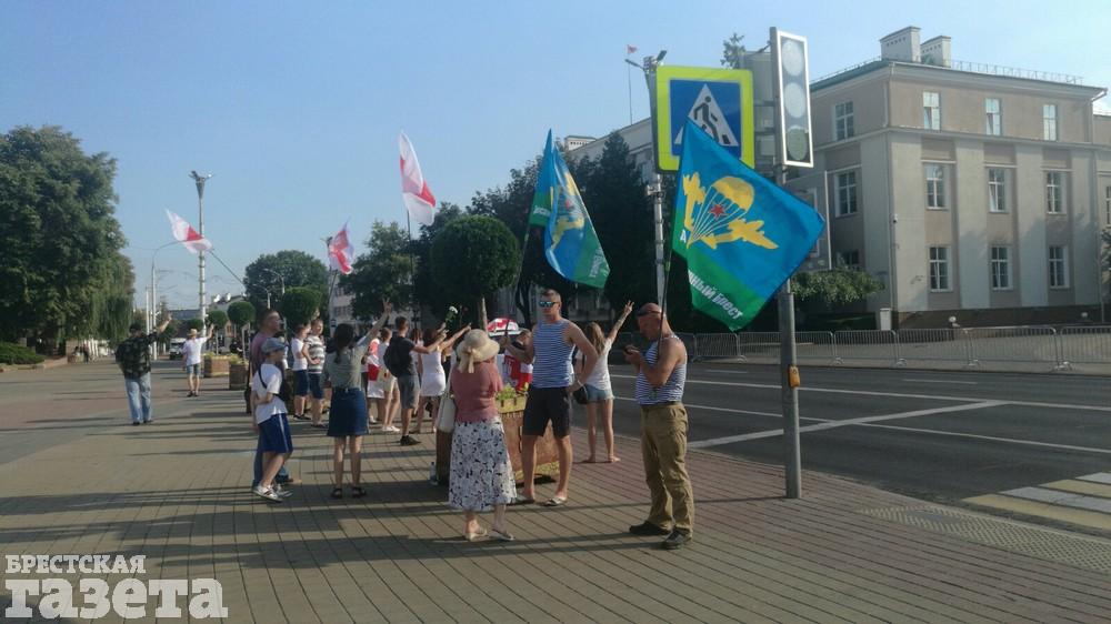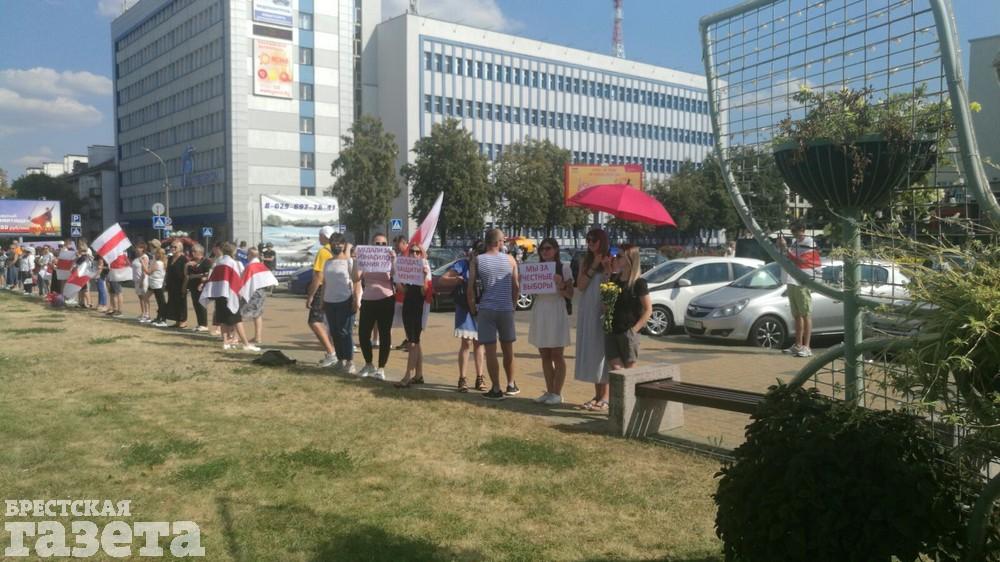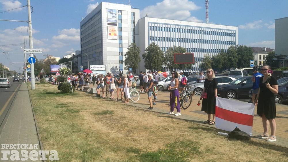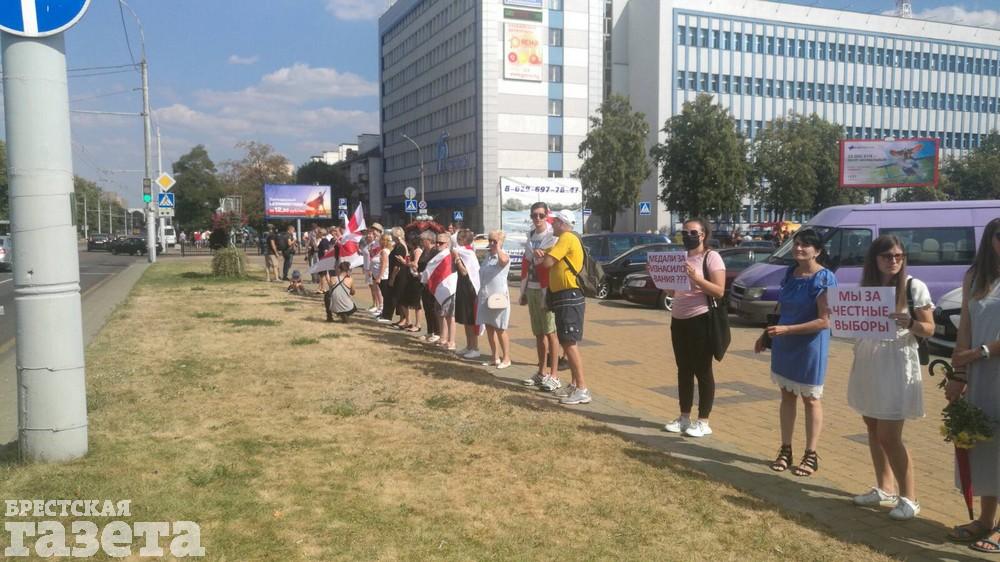 Около 15.00 в Бресте снова начала выстраиваться цепь солидарности. Люди собираются на проспекте Машерова возле ЦУМа. У них в руках, как и прежде, бело-красно-белые флаги, цветы и плакаты.