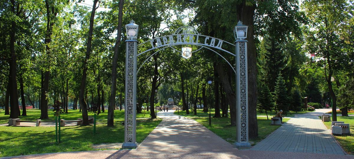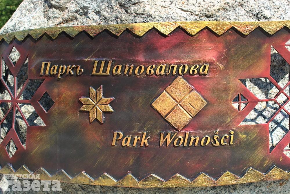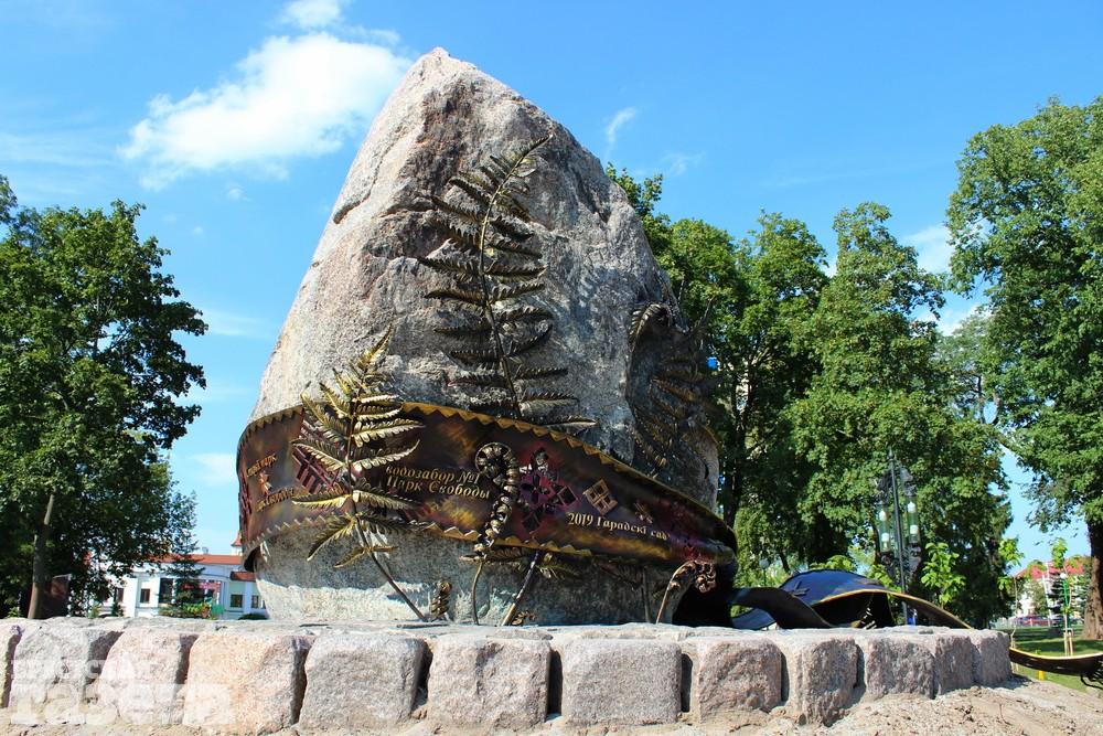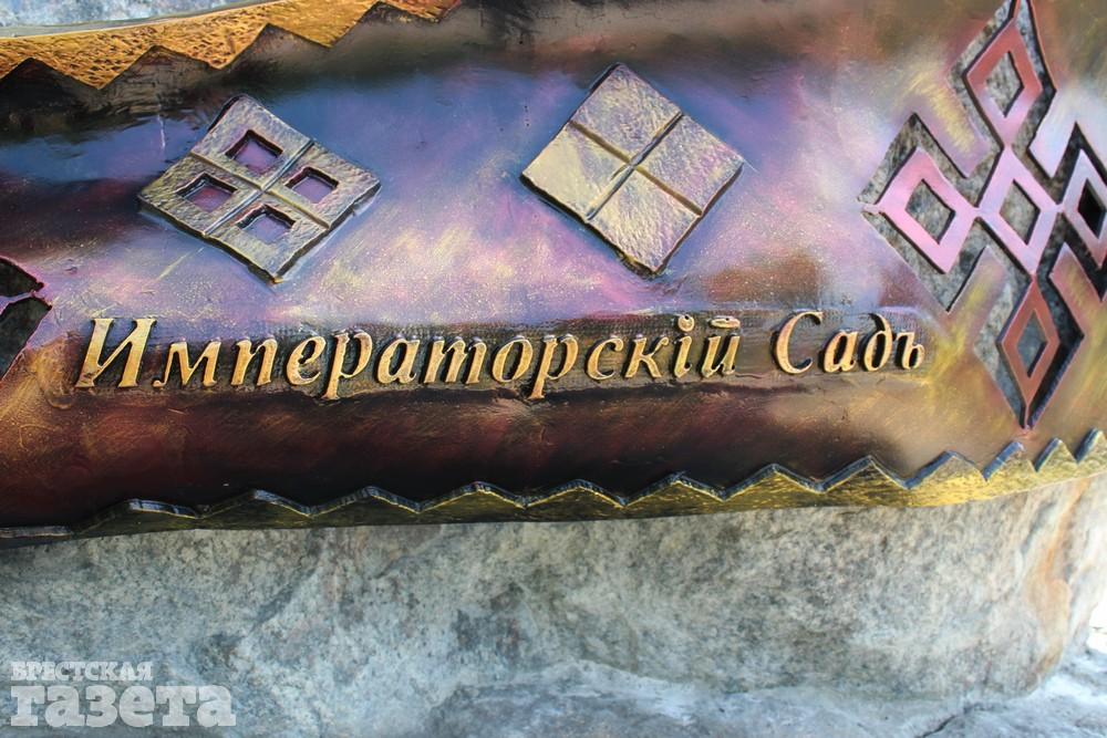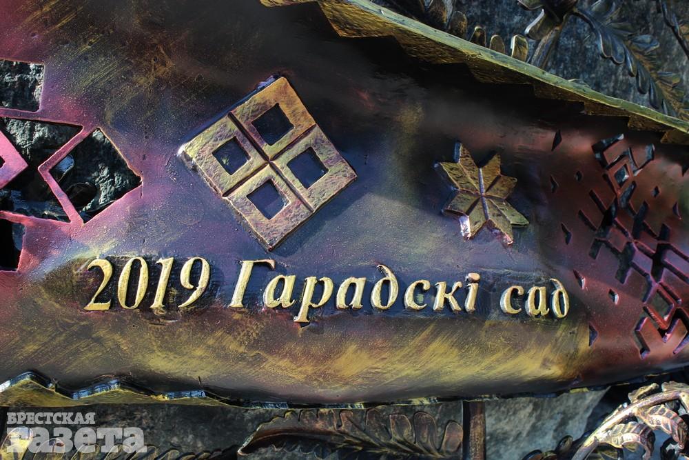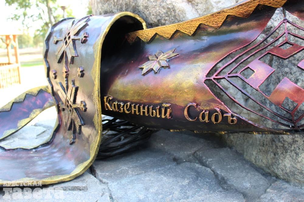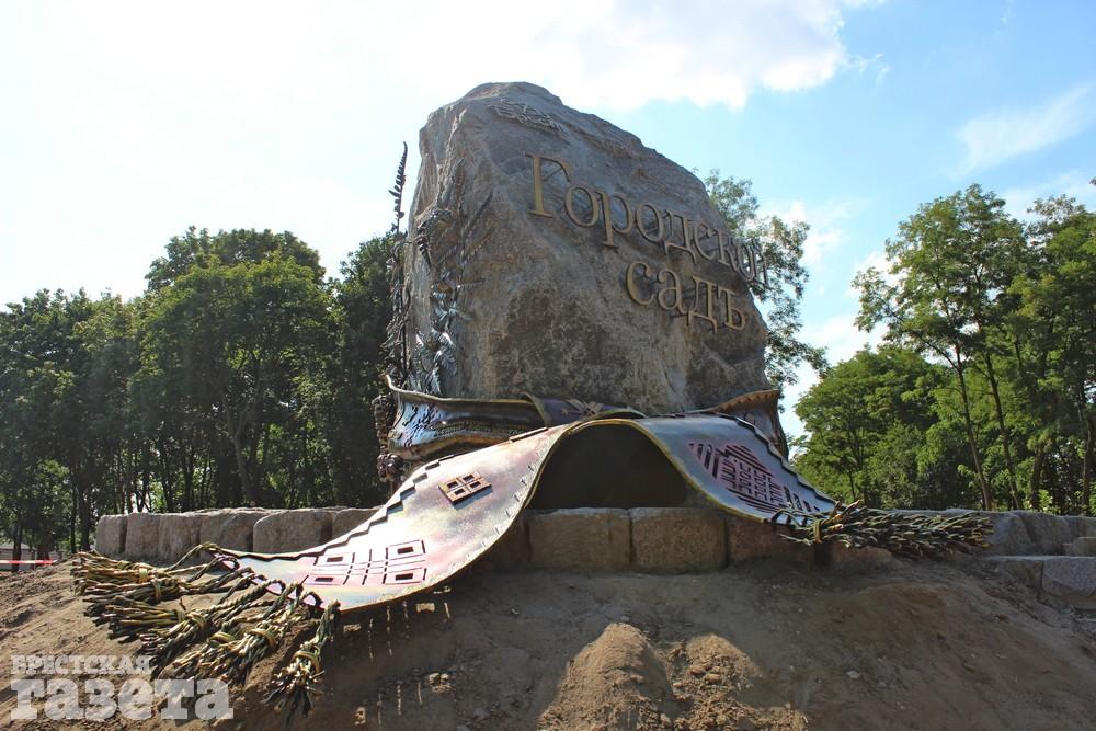На огромном камне появилась надпись «Городской сад», которая видна издалека. У основания валун опоясан кованым рушником с белорусским орнаментом и летописью Сада.