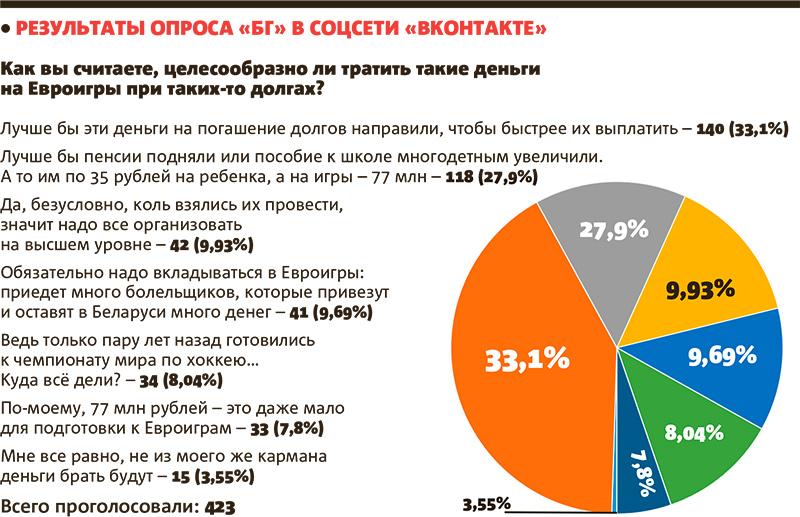 — Я считаю, что вполне допустимо потратить 77 млн на Европейские игры. Это не такие уж и большие деньги. Если разделить их между всеми белорусами, то на каждого придется по рублей семь — на них все равно ничего ценного не купишь. А на подобные мероприятияя, которые проводятся на европейском уровне, приезжают люди бизнеса, из руководства других стран, заключаются договоры межправительственные. И если даже соглашения по этим договорам не будут достигнуты, то всегда можно будет попросить у них еще в долг. А чтобы безболезненно выплатить долги, нужно сократить расходы на армию, чиновников и милицию. Дополнительно можно вкладывать деньги в развитие малого бизнеса.