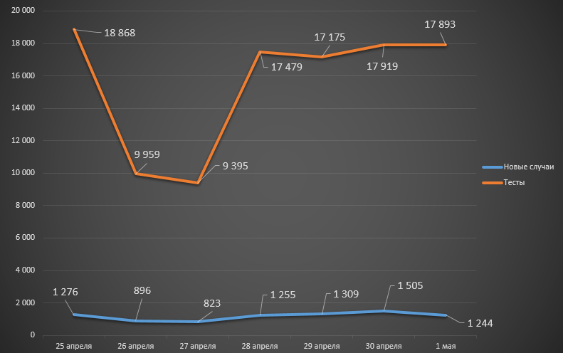 Что касается количества выполненных тестов, то за период с 25 апреля по 1 мая их было 108 688 (на предыдущей неделе – 112 320), а официальная смертность снизилась на 1: неделей ранее было зафиксировано 70 летальных исходов, за последние исследуемые семь дней – 69.